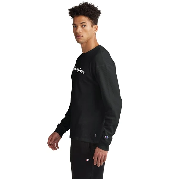 If you wear one long-sleeve tee this season, this is it. Waffle-textured tee provides warmth without weighing you down and delivers a timeless sport look. Whether you’re going to the gym, running errands, or relaxing at home, you’ll wear this warm and durable tee on repeat. Ribbed crewneck and cuffs, stylish woven taglet, and screenprint Champion script logo complete this classic look with a vintage athletic vibe.