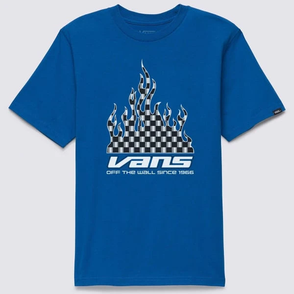 The Vans Boys’ Reflective Checkerboard Flame T-Shirt has a crew neck, short sleeves and the Vans logo with reflective details on the front.